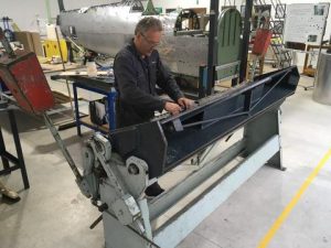 Robin Edwards of RMS Boat Transport based nearby in Portscatho, came to our assistance this week with his telehandler, to move both Merlin engines from their old stands onto new ones made on site. While here he also moved one folder to the wing workshop and our new one into the main workshop. The new one was picked up this week, which will allow us to do more work in house due to its bigger size (2m) and construction.